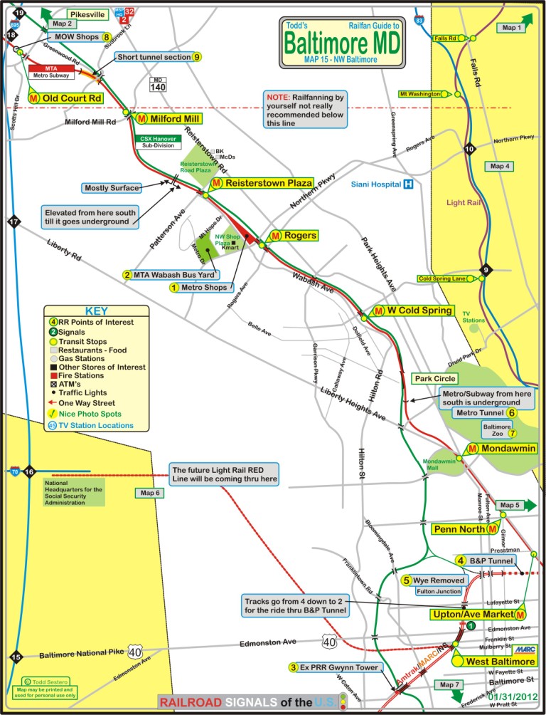 The map covers the NW part of Baltimore city, up to Pikesville in Baltimore County, and follows the mainline of the old Western Maryland (CSX), and the paralleling Metro-Subway track that is heading out to Owings Mills.