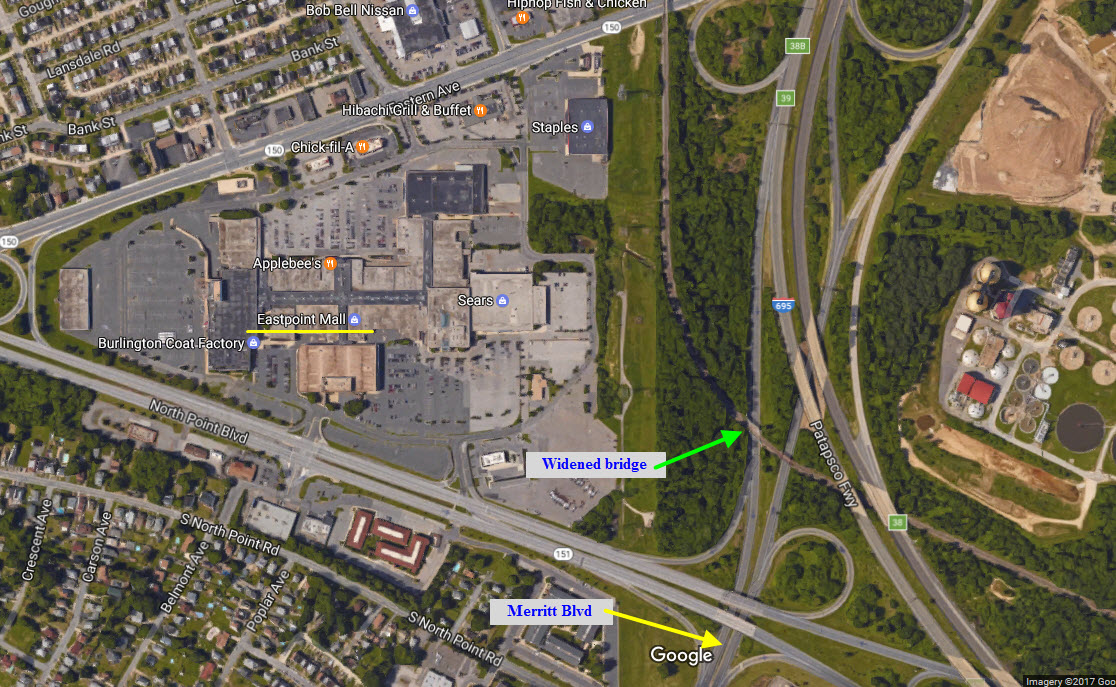 According to one source, this bridge was rebuilt when the Beltway came thru and they had to build an interchange for Merritt Blvd back in the 1960's (not sure of an exact time). It was widened to