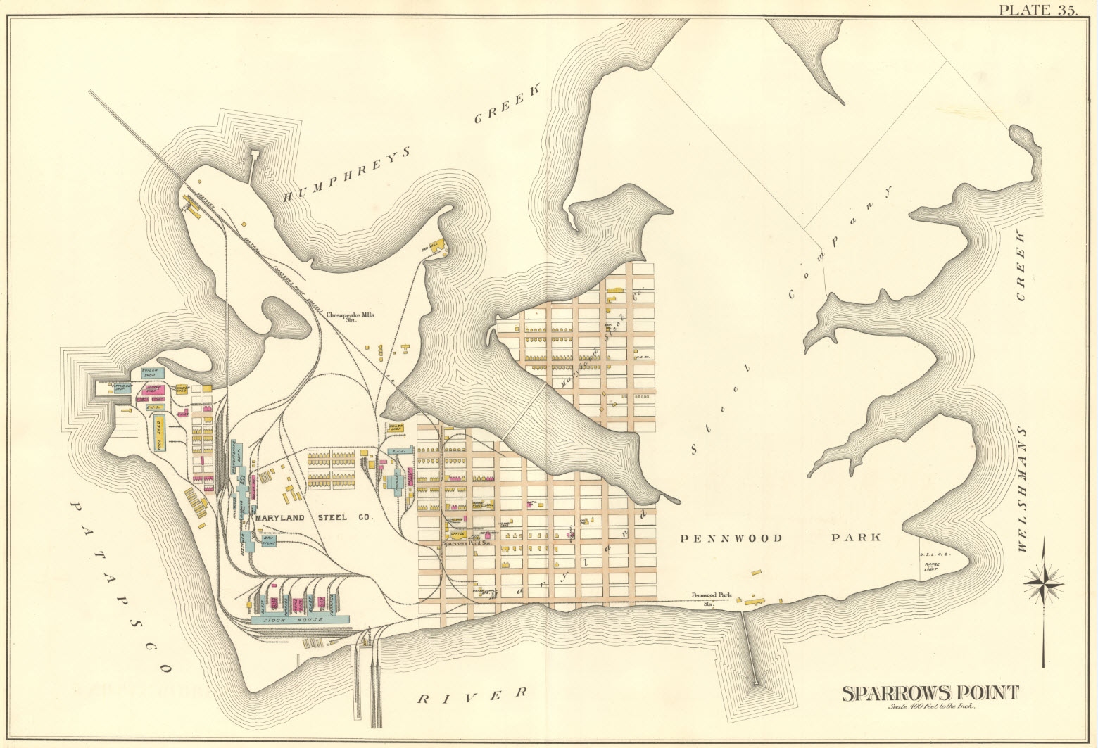 village of Sparrows Point, with a church and homes, buried in the middle of the giant industrial complex. Not sure when the town center disappeared.
