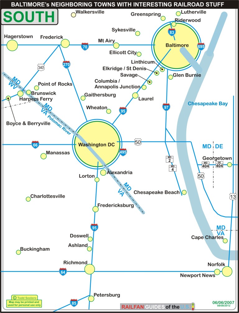 If this is a railfan page, every effort has been made to make sure that the information contained on this map and in this railfan guide is correct. Once in a while, an error may creep in, especially if restaurants or gas stations open, close, or change names. Most of my maps are a result of personal observation after visiting these locations. I have always felt that a picture is worth a thousand words", and I feel annotated maps such as the ones I work up do the same justice for the railfan over a simple text description of the area. Since the main focus of my website is railroad signals, the railfan guides are oriented towards the signal fan being able to locate them. Since most of us railheads don't have just trains as a hobby, I have also tried to point out where other interesting sites of the area are.... things like fire stations, neat bridges, or other significant historical or geographical feature. While some may feel they shouldn't be included, these other things tend to make MY trips a lot more interesting.... stuff like where the C&O Canal has a bridge going over a river (the Monocacy Aqueduct) between Point of Rocks and Gaithersburg MD, it's way cool to realize this bridge to support a water "road" over a river was built in the 1830's!!!
