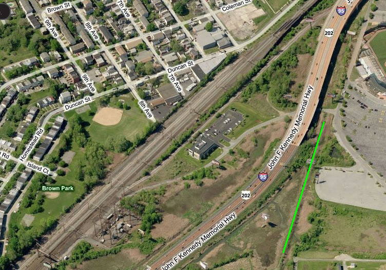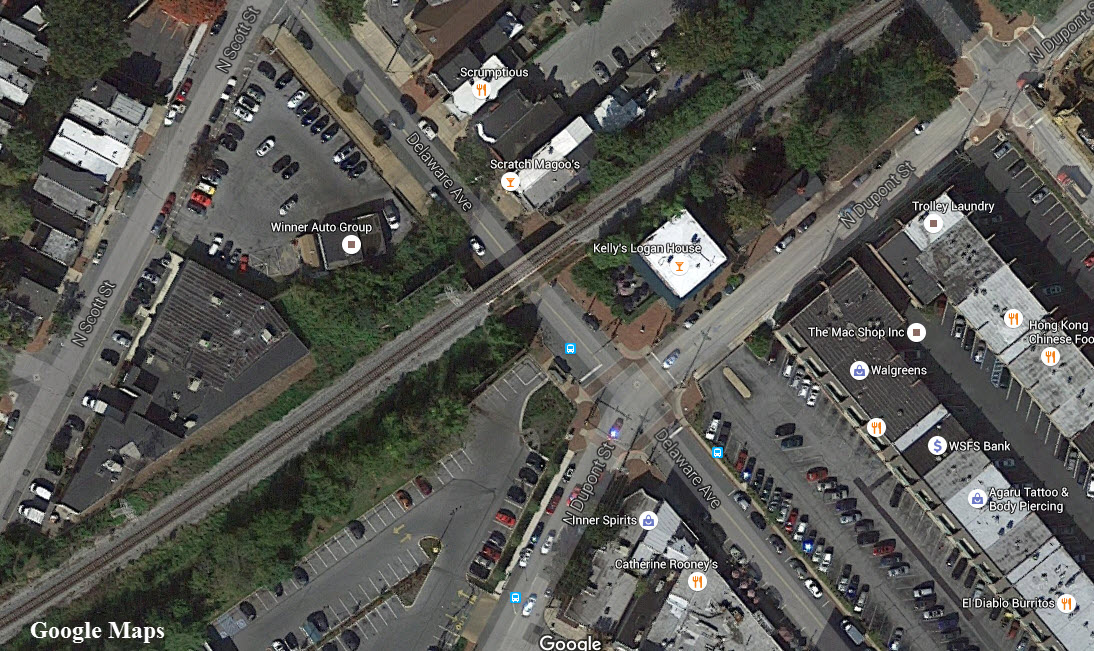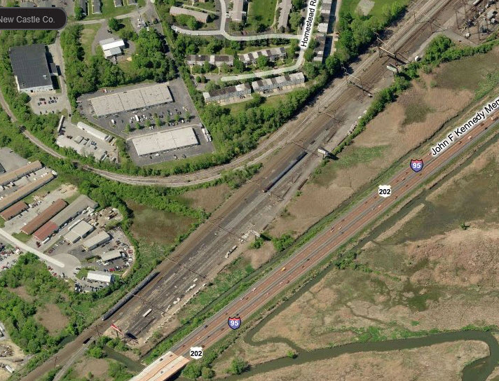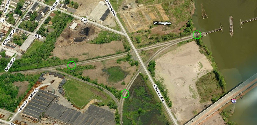 Signal locations are shown by the green circles. The south leg of the wye is the New Castle Secondary track. The west to south part of the wye is a relative newcomer, not being on the track plan below from 1962. There is precious little, if any, evidence of the RDG track that used to parallel Christiana Ave.
