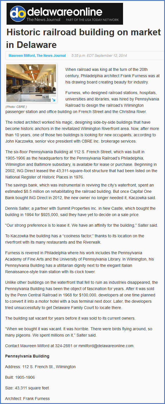 In the shadow of the PRR's Wilmington Station was the B&O freight/passenger depot. It was on a stub track, not a through track, which may explain why it was never a success in downtown Wilmington as the Pennsy's station was. How many of us have been to downtown Wilmington and passed right by this beautiful building without knowing it's heritage? For many years it sat idle, but not being in the way of anything particular, was left alone. When the bank ING moved into town, they acquired and renovated it. The building became a Capitol 1 property when they bought ING in 2012. The two full size pictures are courtesy Bruce Dunlap. These is a nice market type mini-mall across the street for good eatin.