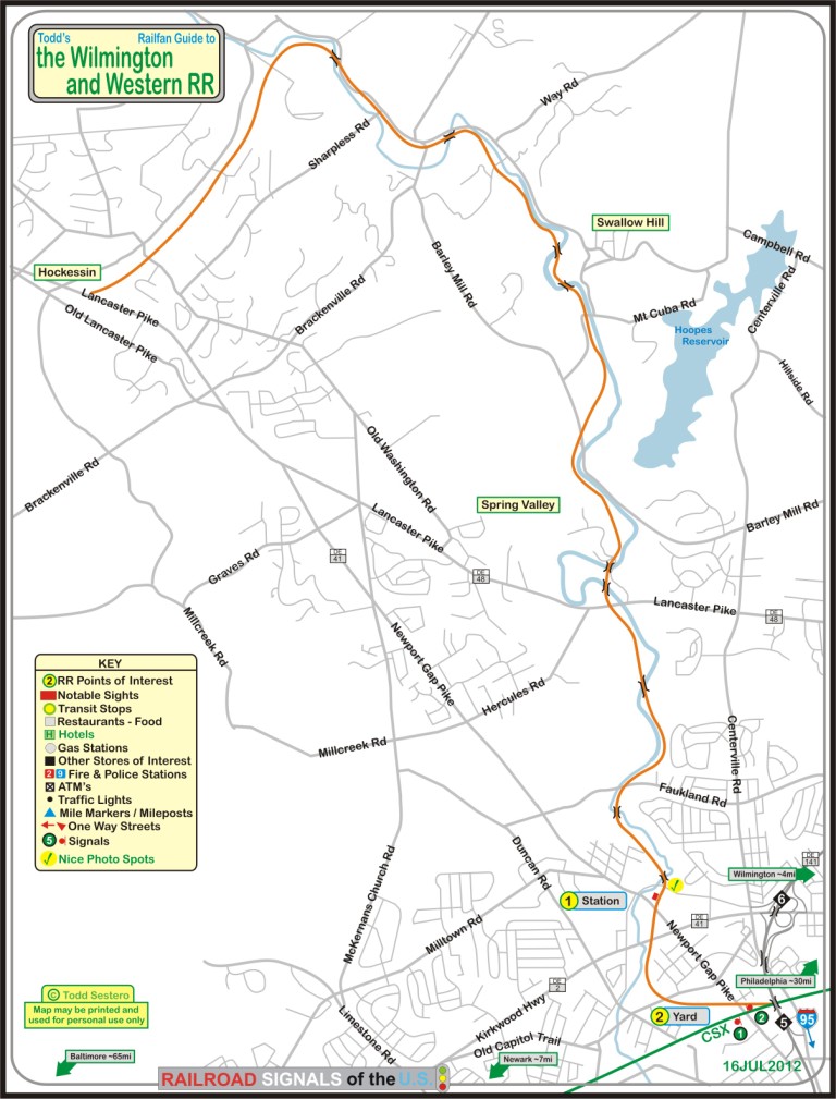 If you're travelling into the area via I-95, take exit 3 for DE 141, and head north. Take exit 5 for Centerville Rd, and then make a left at Boxwood Rd, going over 141. Just after going over 141, take a right onto Newport and Gap Turnpike. This will take you to the railroad.