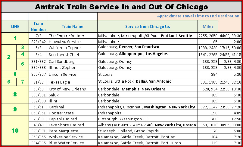 The table below shows you the Amtrak trains currently serving Chicago. Just for reference, I added the distance and time from Chicago to reach the final destinations of the name trains, and where two sets of numbers are provided, it is to the two cities highlighted in Bold.