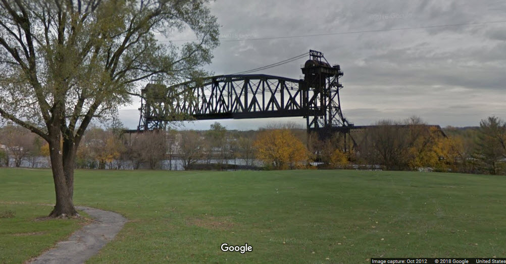 vertical lift type bridge comes down to let a passing BNSF or Amtrak come thru.