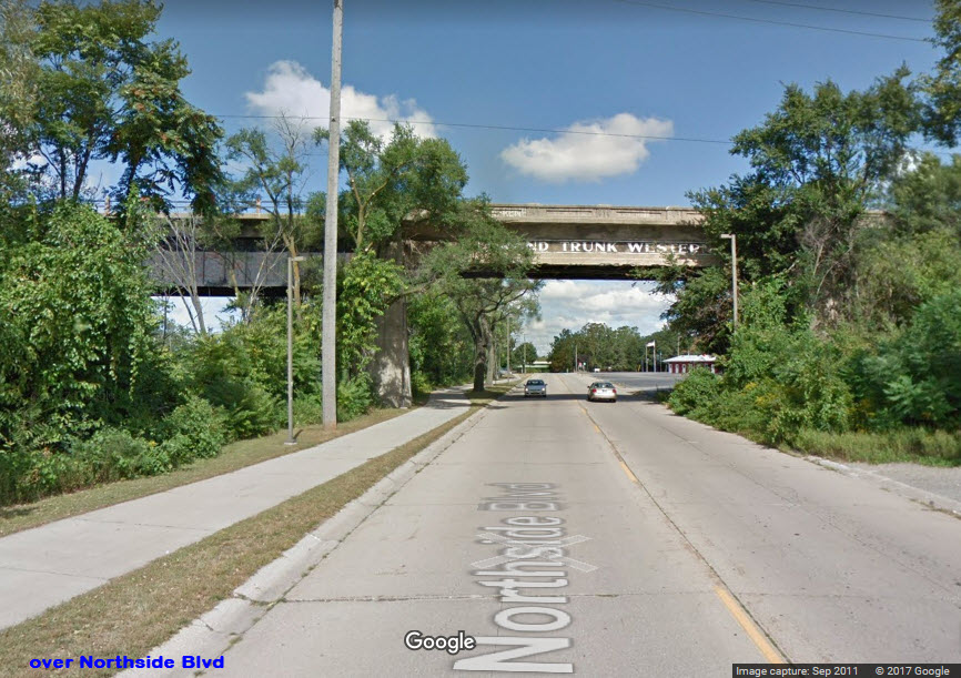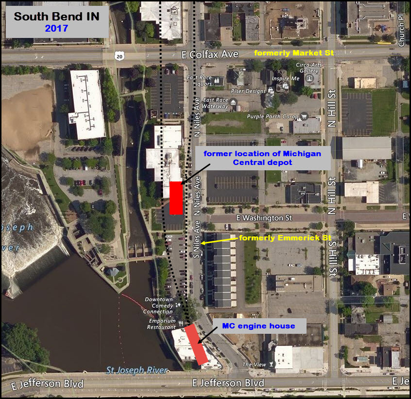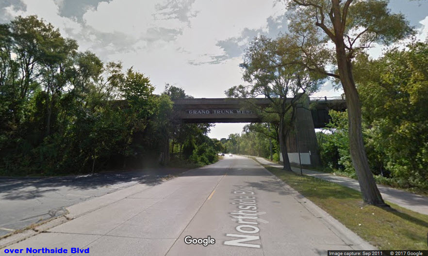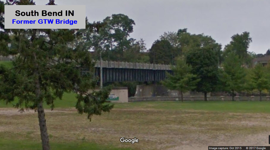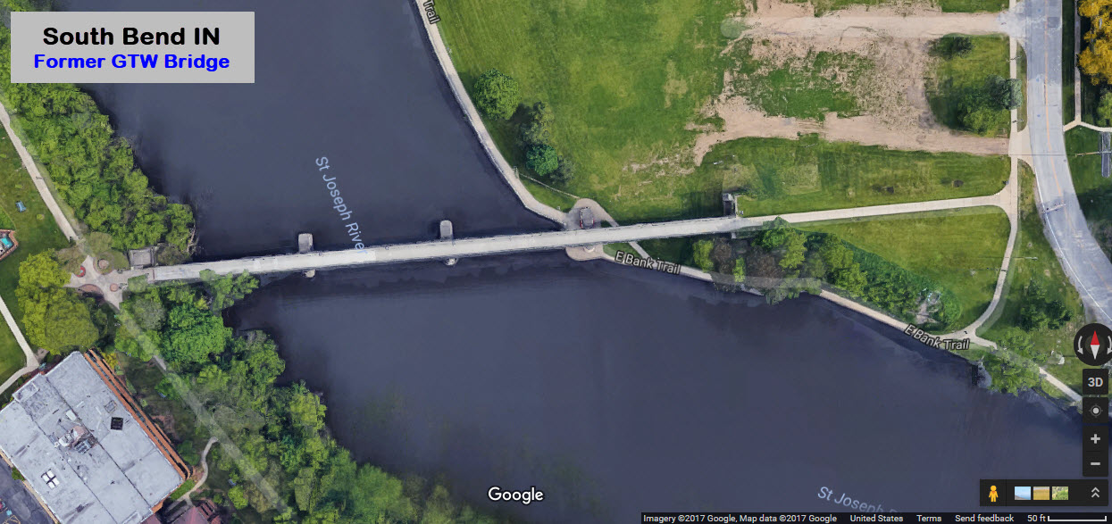 A pedestrian walkway now occupies what used to be the Grand Trunk's main line bridge over the St Joseph River, off the east