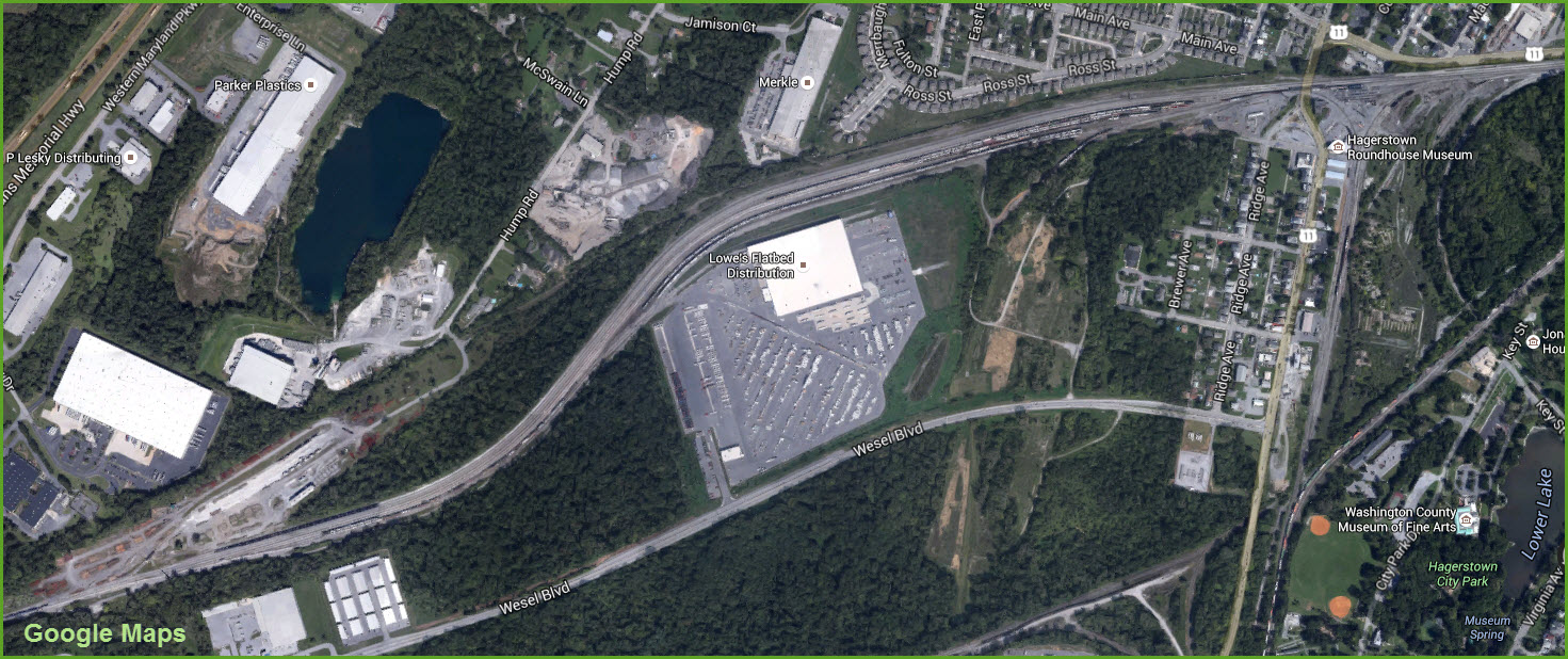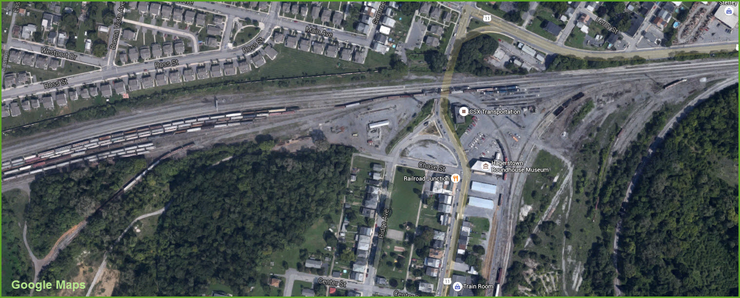 Hagerstown is at the crossroads of what used to be the Western Maryland, the Pennsy, the Baltimore and Ohio, and the Norfolk and Western. It's now served by CSX (B&O and WM) and the NS (N&W and PRR). Thru freights on both roads share the ROW going past the Police Station in the downtown area.