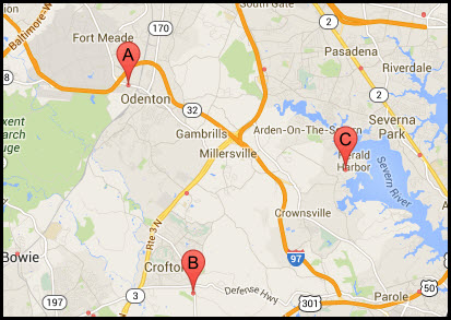 You can also come down from the Baltimore Beltway on MD 3, all the way to Md 175, Annapolis Rd (red arrow), and head west.