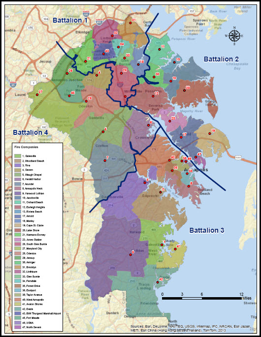 The map below is from the county website, and shows the locations of all of the fire stations in Anne Arundel county.