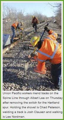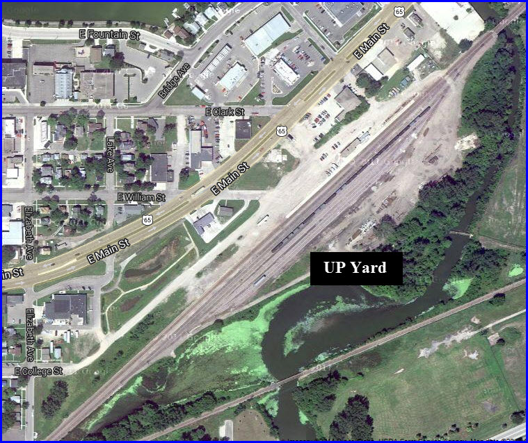 The Union Pacific trackage used to belong to the CNW, and the IC&E was formerly the Milwaukee (and then SOO). I need to do further research into the lineage for the DM&E/UP's track heading NW out of town, after it was the M&StL. If anyone knows and wants to share, please email me.