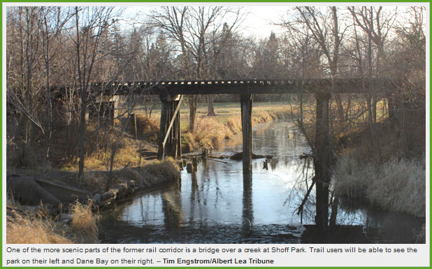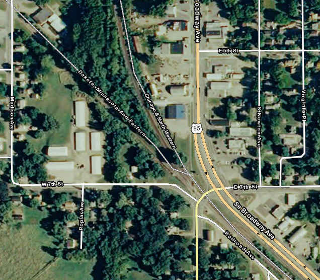 Update Feb 2014 - The M&StL / UP N-S line was vacated several years ago (in 2011) and all trackage has been removed. It was vacated as far as the grain elevator (pictured at the bottom of the page) which is now served from the North only through Waseca. This eliminated the western diamond on Front St and the junction on the south side as well. Jim Mihalek provided a link to an article on the change: http://www.albertleatribune.com/2011/11/a-future-trail/