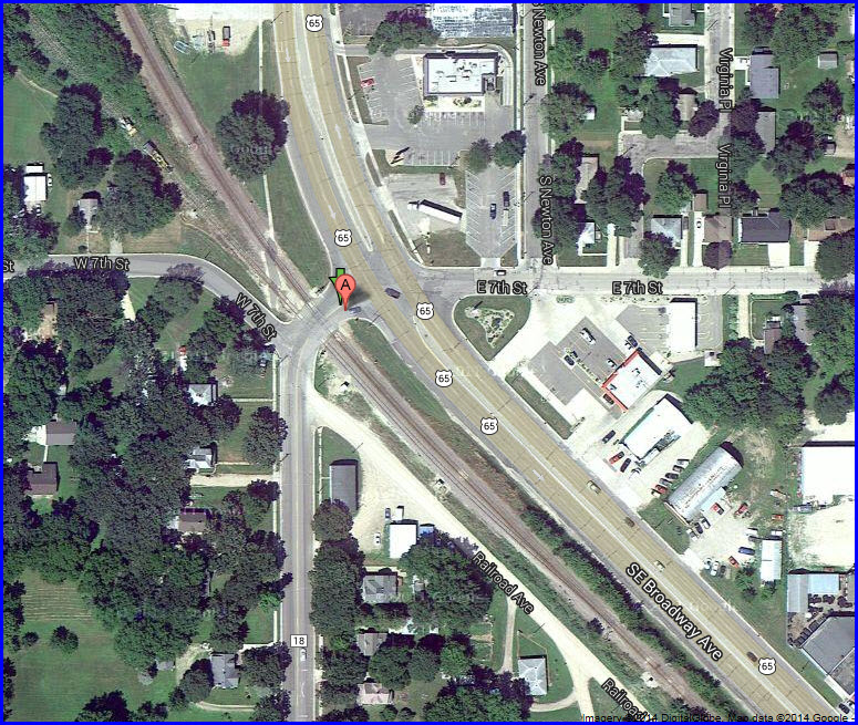 Out of the map services from Google, Bing, and Mapquest, Mapquest had the best satellite photos of Albert Lea when I originally did this page, but in 2013, Google has some terrific satellite photos of Albert Lea, as seen below. I left the Mapquest map here, because it labels the railroads!