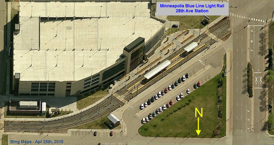 The Target Field Station opened in 2009 to allow commuters easy access to the Northstar Commuter Rail Line. As of this date (the end of 2011), Google wins in the aerial photo category, as Bing has not updated their fly-by pictures yet. The light rail station is right at the commuter rail station, and goes into a short single track section before going into a double track stub... my guess is that it was easier and cheaper to do this than build a double crossover.
