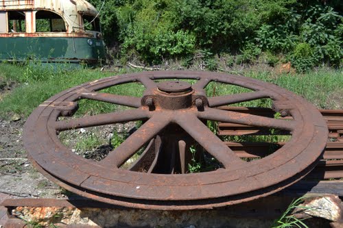 An underground cable car wheel from Paca Street on display at the M&Pa warehouse.
