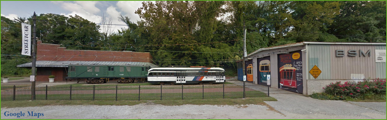 The north end of the carbarn, with the visitors center on the left. The NJT (New Jersey Transit) car and sweeper stand watch over everything.