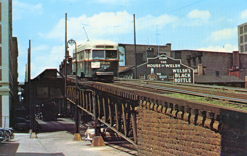 A PCC car rides over one of the few elevated sections of streetcar trackage in Baltimore, near where the Ravens Stadium is today.