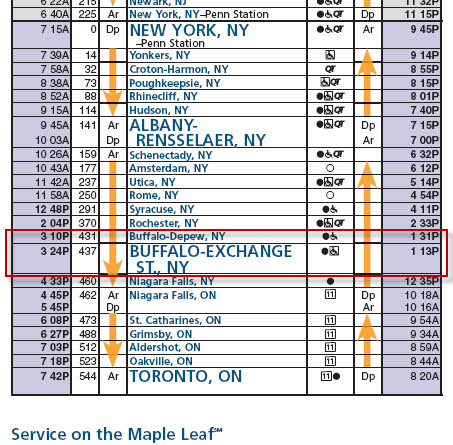 Amtrak has two stations in the area, three if you count the one in Niagara Falls. One is downtown, and the other is east in Depew. Schedules are below.