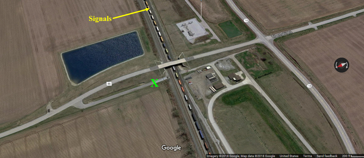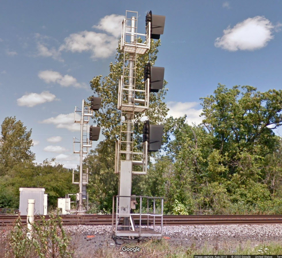 this is looking west towards the facility, with interlocking signals for going into and coming out of the yard.