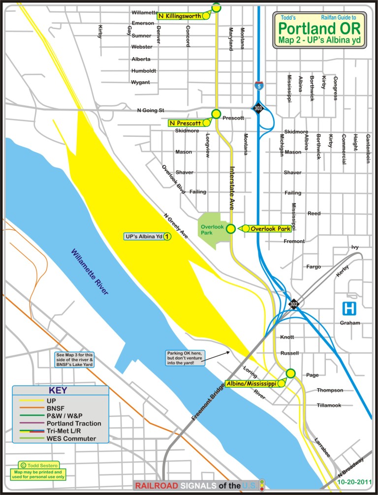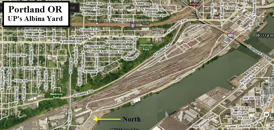 Albina Yard is UP's "showpiece" of the Portland area, followed by the Milwaukie Yard, which it acquired along with the Southern Pacific. When I was there, railfans were OK with being on the southern access road to take pictures, as long as "we" don't enter the yard itself..... Don't know if they are still easygoing. The south end of the yard hits the wye at the east end of the Steel Bridge, and then heads on south and east.