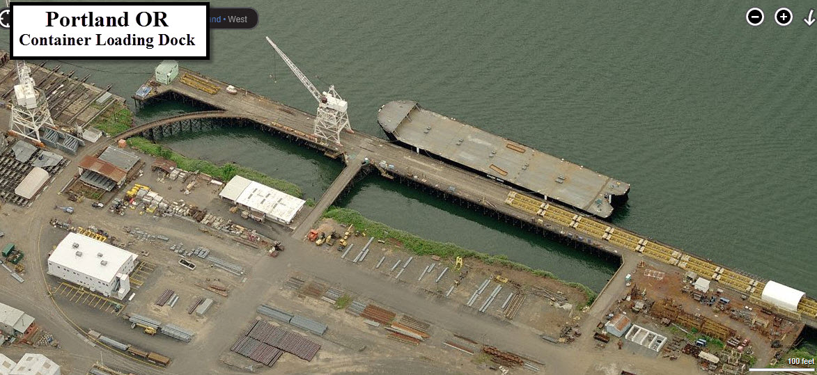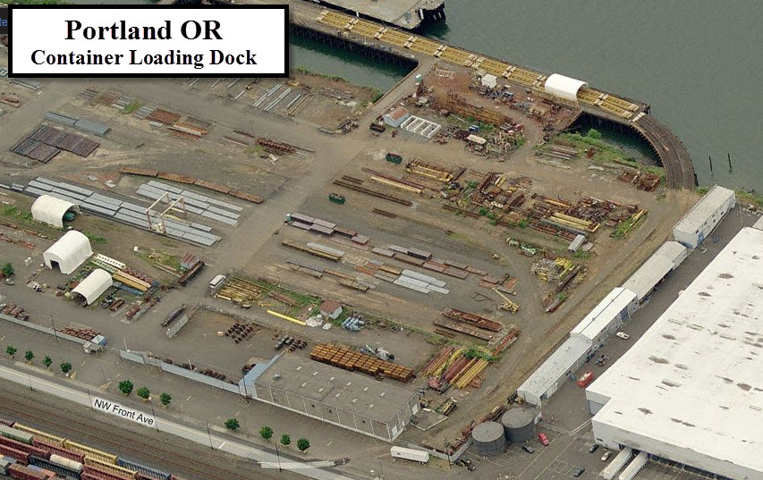 Adjacent to Gunderson, and across Front Ave from Lake yard, is this "small" container loading and unloading facility. What makes this one neat, and offers possibilities for a model pike, is the unique loop going out to the dock... take a look.