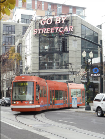 Portland Streetcar "Central Loop" first run. Car 009 climbing the Lovejoy Street ramp to the Broadway Bridge.