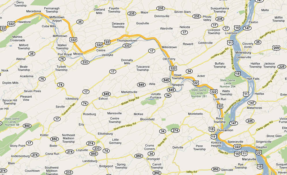 To follow the main line west out of Harrisburg, it's a simple drive up the west side of the Susquehanna on US15/11. If you want to bypass all of the stuff on the west coast and save maybe 20-30 minutes of driving, you can take US322/22 on the east side of the river up to Duncannon, where you can jump off and follow the mainline.