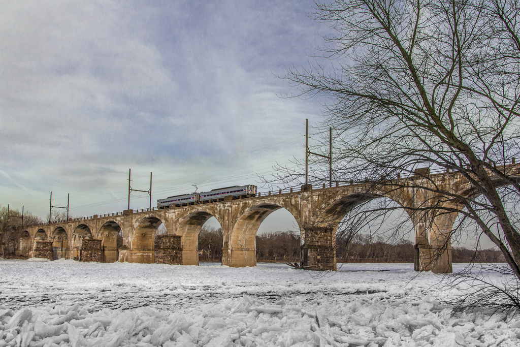 This two track concrete viaduct crosses the Delaware River, and handles