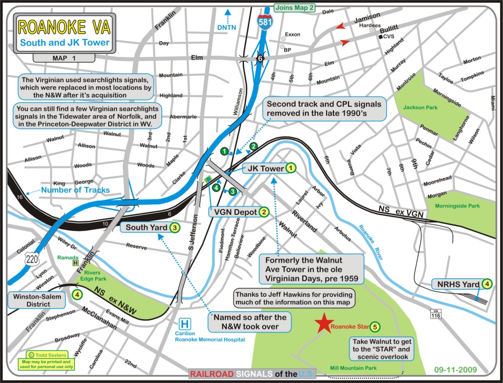 This map covers the south side of Roanoke, which includes JK Junction, the ex Virginian yard now named "South Yard", and the NRHS storage area in an industrial park off 9th.