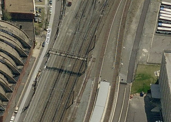 into the platform tracks. The birds eye view is looking south.