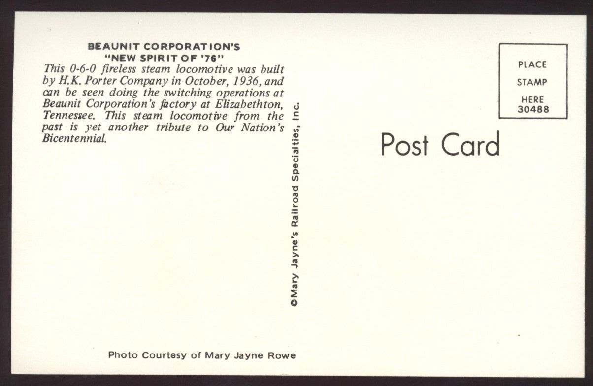 Believe it or not, 8 miles away in Elizabethton, there was an industry (the Beaunit Corp) operating a fireless steam engine to move its cars. This was the kind of
