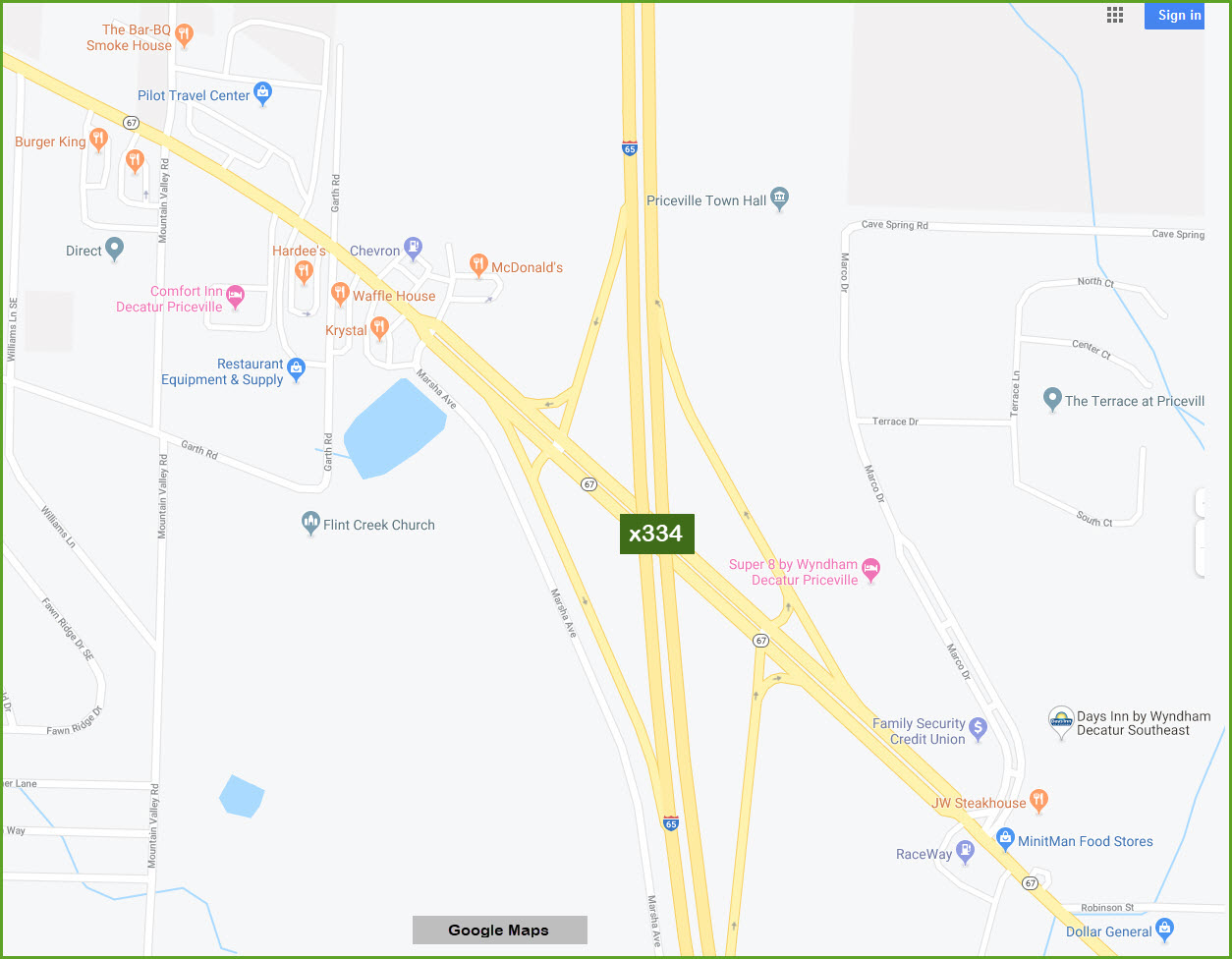 On the south side of the Tennessee River, take exit 334, go west 4.4mi on AL