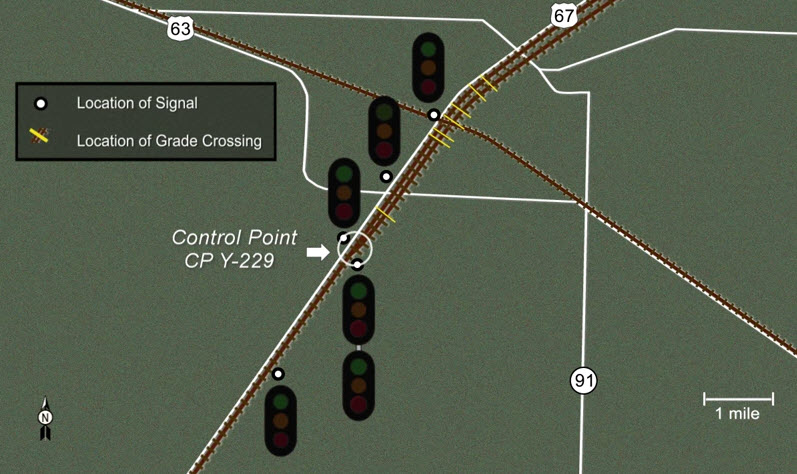 South Sub-Division. The crossing is at MP 226 on the UP, and MP 398 on the BNSF.