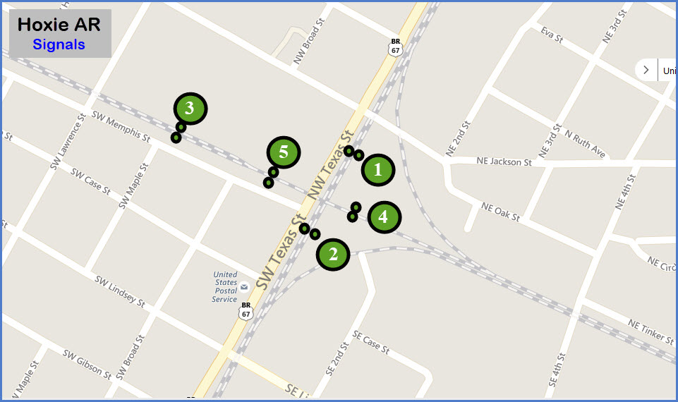 These signals are 1.5 miles from the diamond in Walnut Ridge, and the intersection of Front and Main Streets, AR34, US 412, and US 67 business.