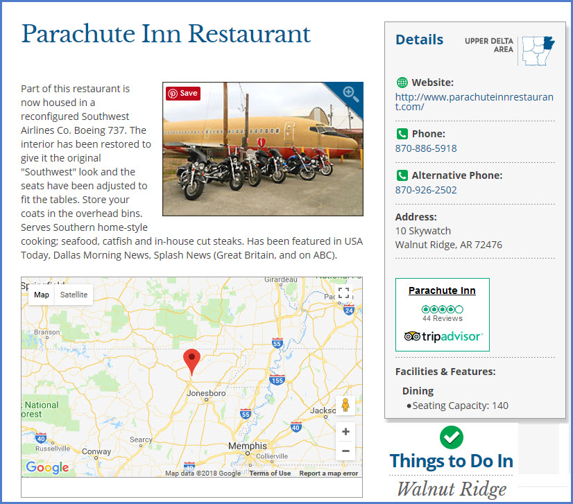 The Parachute Inn, at the Walnut Ridge airport, offers good style American fare, and has a cockpit for the kids, small and large, to play in....