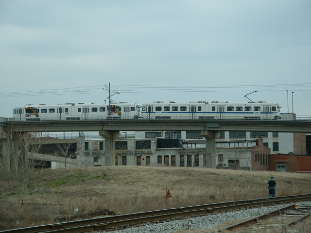 A passing Light Rail train, and the view from here looking towards Riverside.