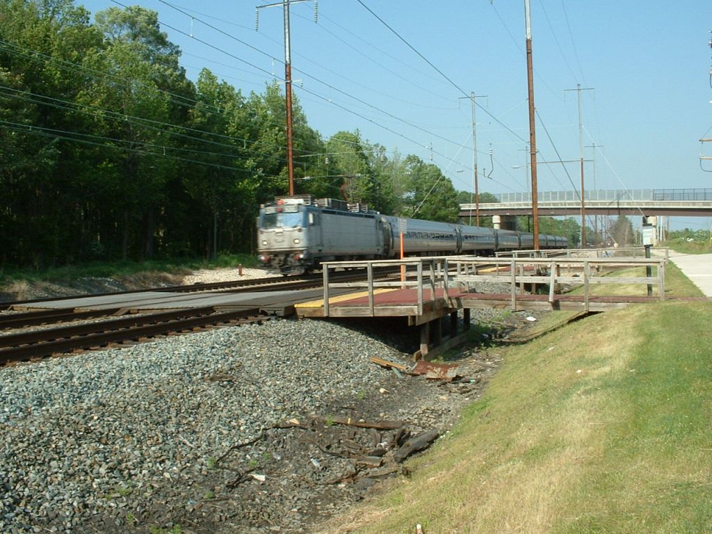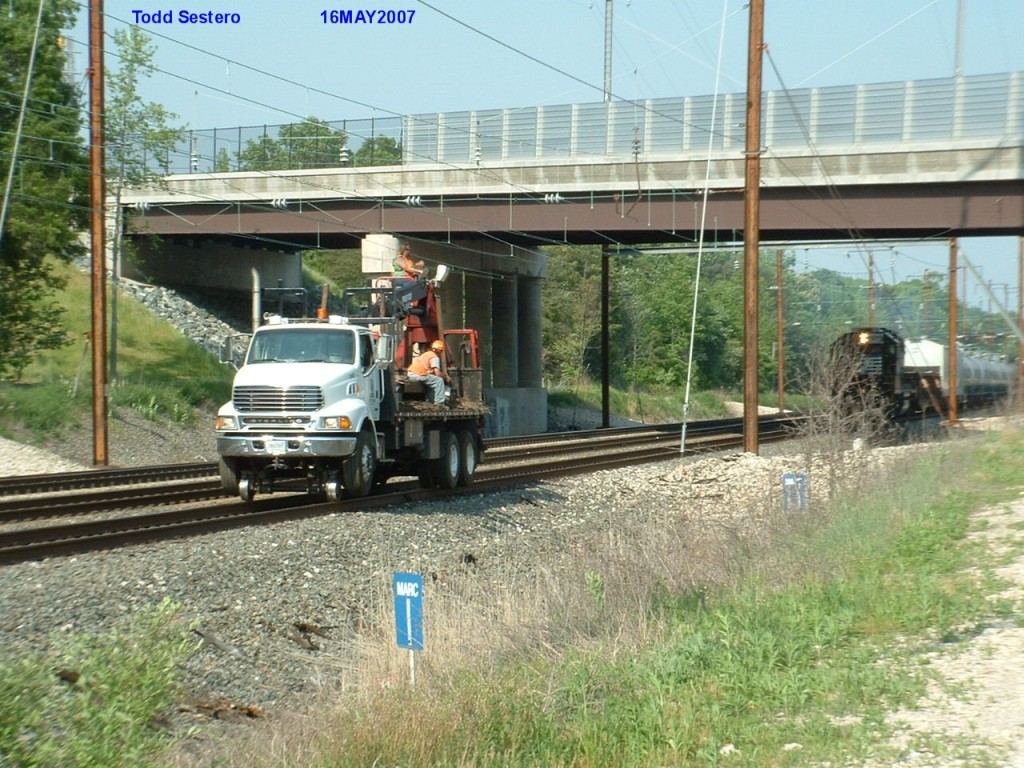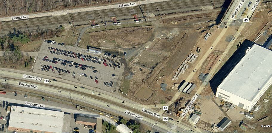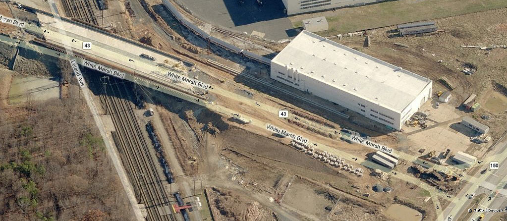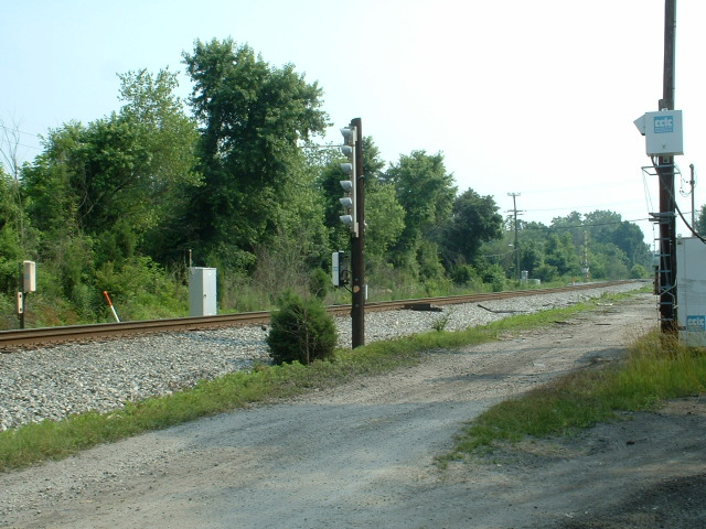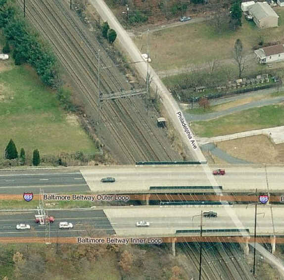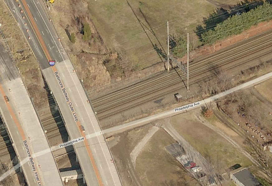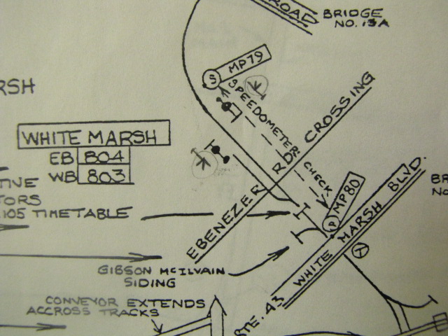Besides being a good spot for both SB and NB freights, there is a set of intermediate signals just north of the crossing, and equipment detectors here. The signals are on the B&O drawings as WHITEMARSH, and the EB signal is 804, the WB is 803. Next signal set north of here is LORELEY, and south is POPLAR.