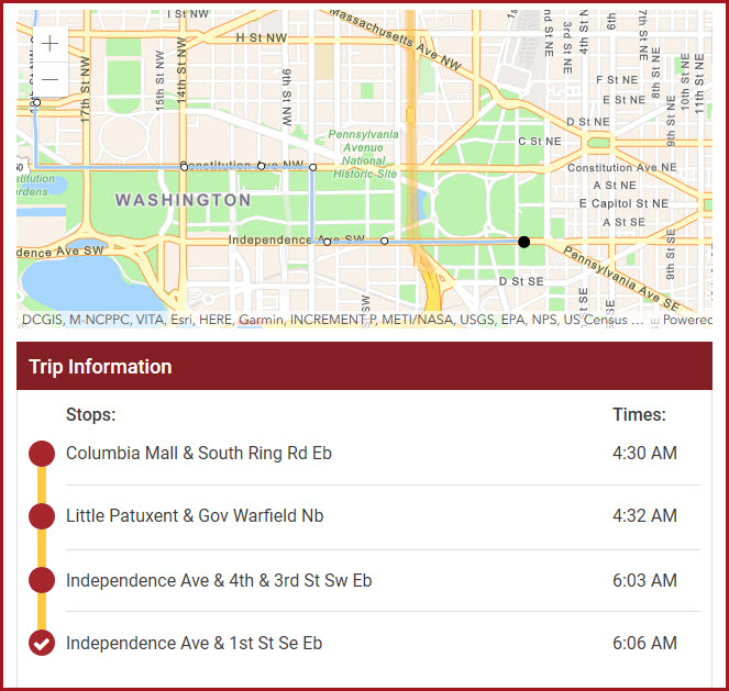 Example of the info shown for route 305-Columbia/Silver Spring/DC: