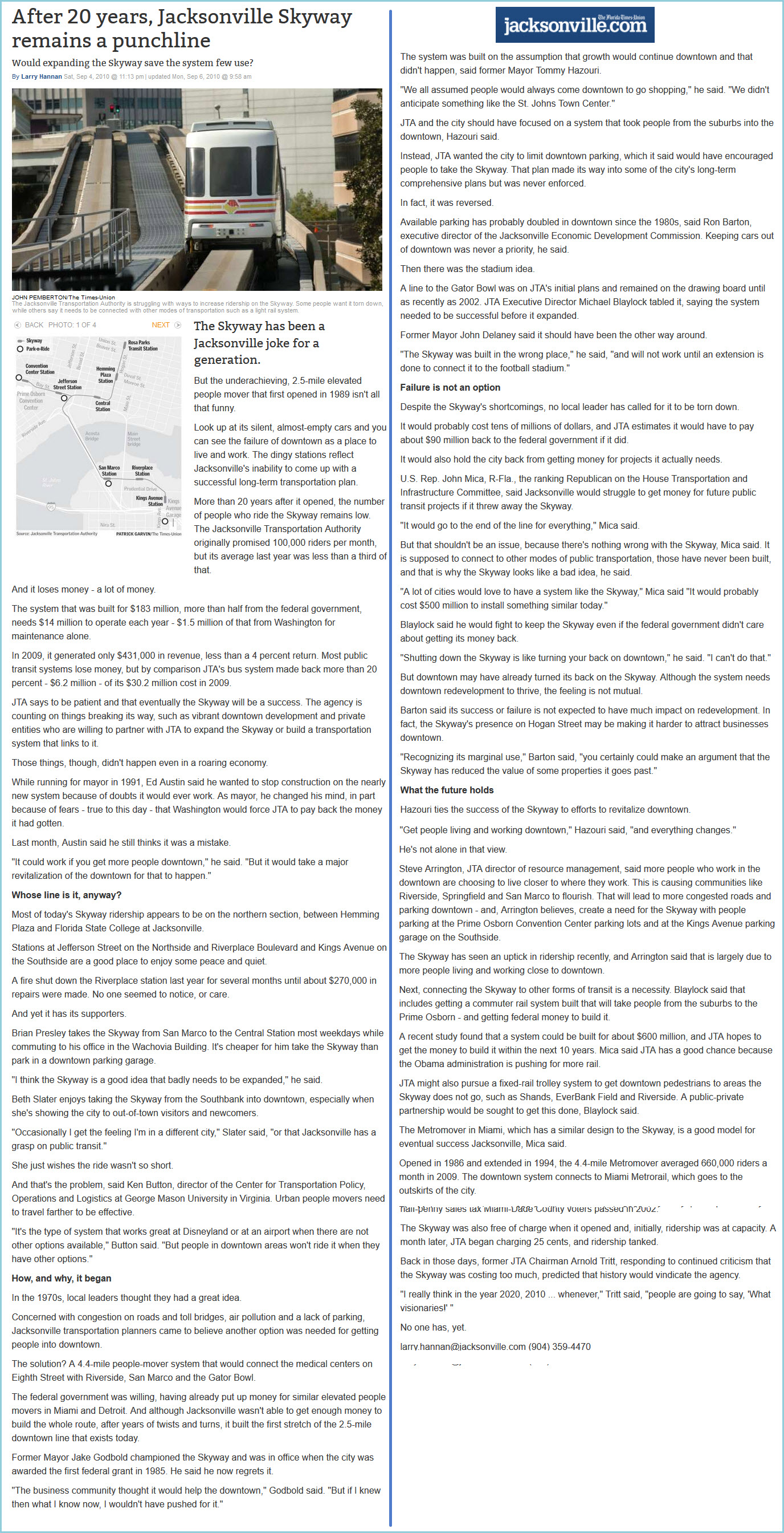 The Jacksonville (Florida) Automated Skyway Express, or "Skyway" has evolved after many years of study by both citizens and professional