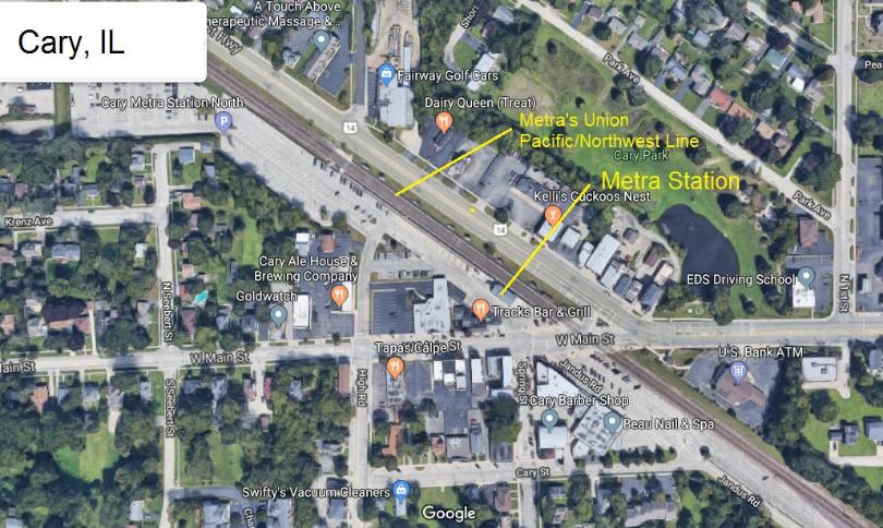 Chicago. All of the trains here are Metra trains. There is a Gazebo just across Main Street from the Cary station