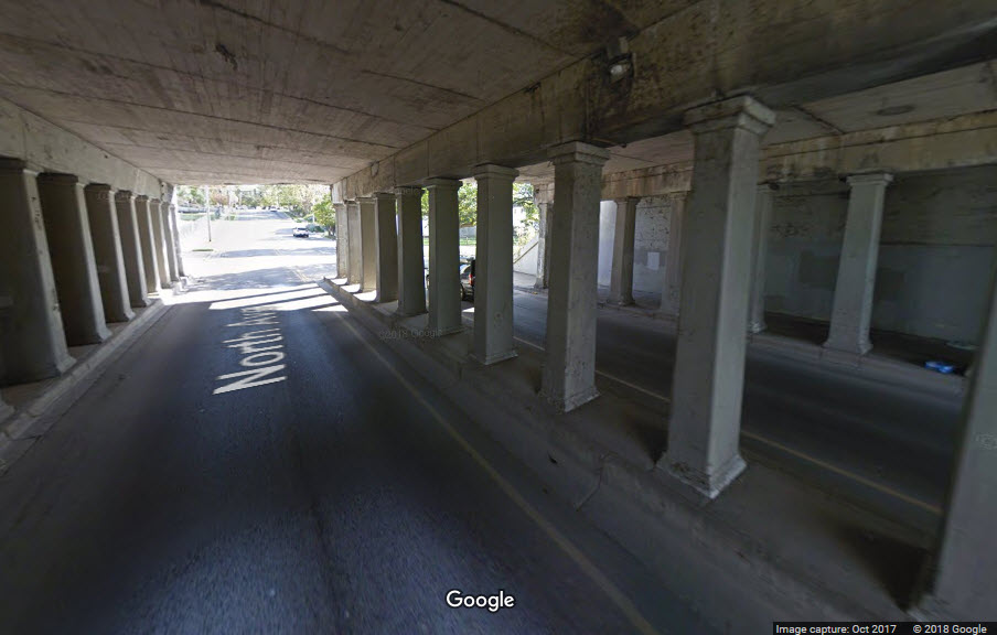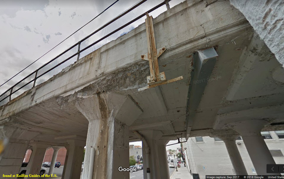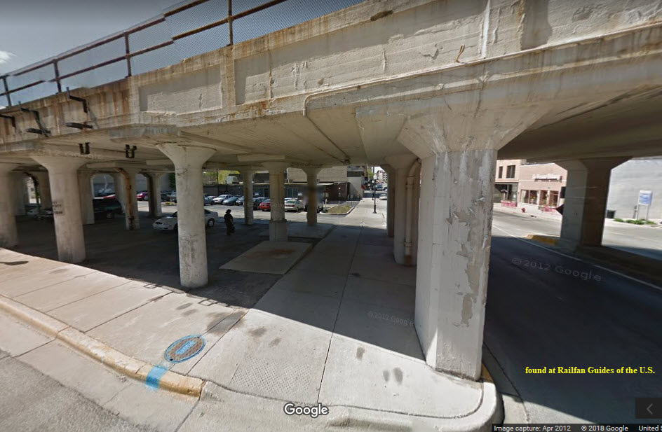 This elevated structure extends from Benton St on the south to New York St on the north end, a distance of 4 blocks or about 1900 feet if you include the giant overpass