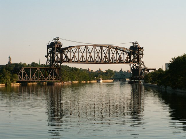 vertical lift type bridge comes down to let a passing BNSF or Amtrak come thru.