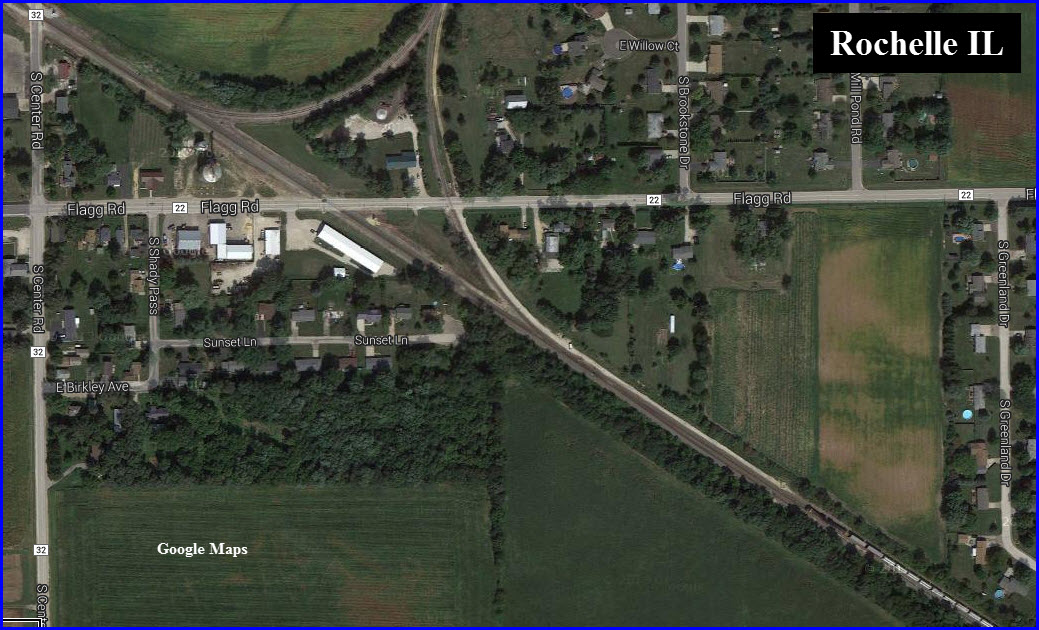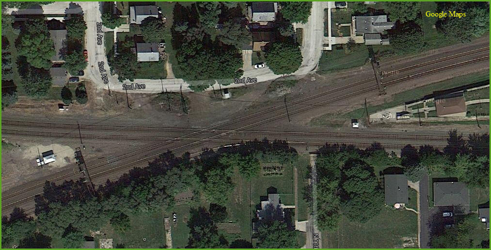 On the west side of the diamond, the UP has only one crossing at 1st St before it reaches the yard. It's the same story for the BNSF at 15th St, and then another grade crossing about 2 miles away NW at Flagg Rd, where there is a small wye. S Central Rd also hits the NW leg of the wye. Just before the rail line hits the wye, there is an interlocking where the tracks go from double (going towards Chicago) and single (heading NW).