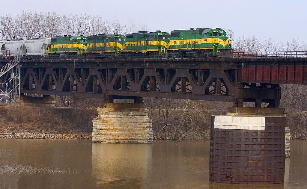 A Louisville and Indiana train crossing the Portland canal. The north bound train is shown immediately prior to entering the vertical lift portion of the