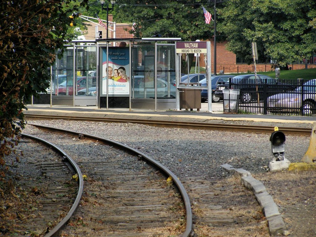 MBTA commuter rail station, outbound side. Taken from Moody St. facing west.