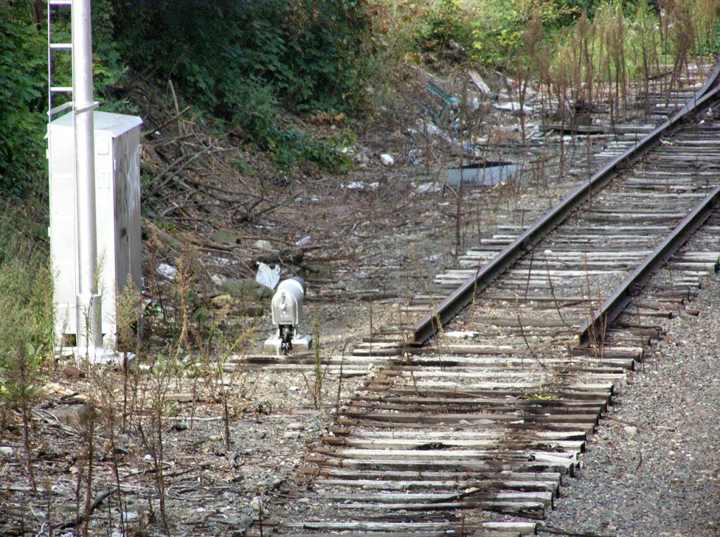 The siding has been disconnected from the mainline, and the freight cars on