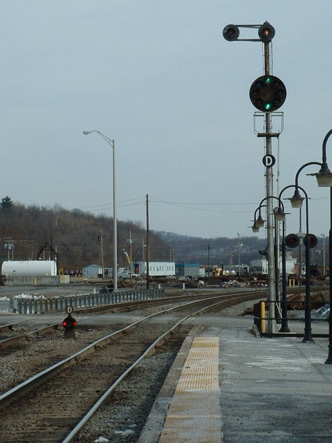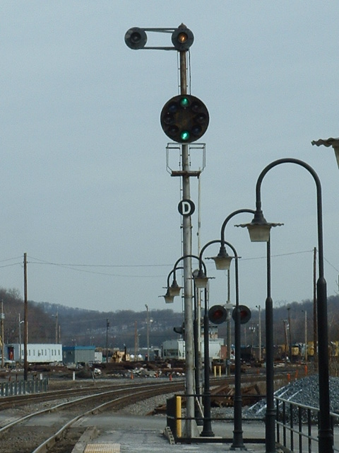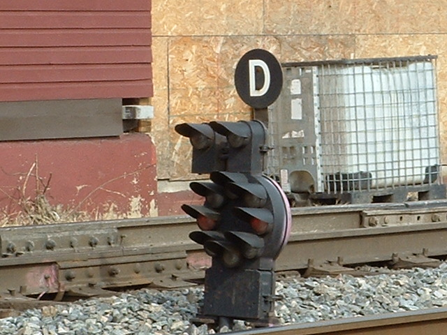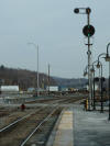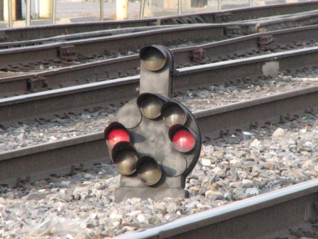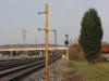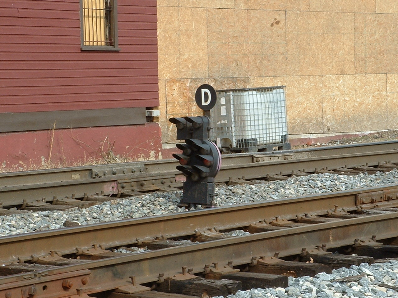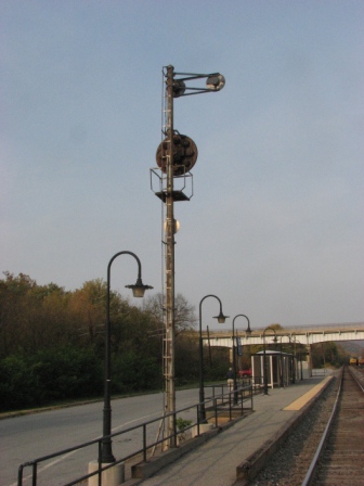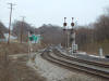 Dwarf signal off the west end of the EB platform, governing moves to either side of the platform.