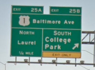 go just one exit to the US Route 1 (Baltimore Ave) exit, exit 25B, and head