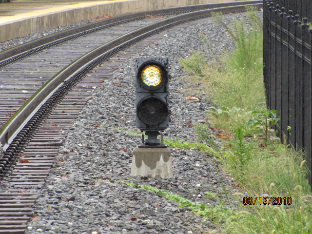A US&S two color color light dwarf signal controls movements into the station.