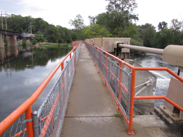 The flood control dam with a jogging path / walkway going over it.... good for train shots.
