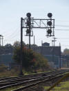 Two sets of signals here. A single mast mounted signal for trains inbound to the yard, and two sets on a cantilever for outbounds.
